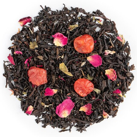 Состав: чай чёрный китайский, ягоды вишни, лепестки розы, листья ежевики, аромат дикой вишни.