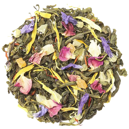 Ярко выраженное восточное благоухание зелёного китайского крупнолистового чая дополняется за счет кусочков спелых плодов ананаса, приправленных соцветиями мальвы, сафлора, красной розы и календулы.