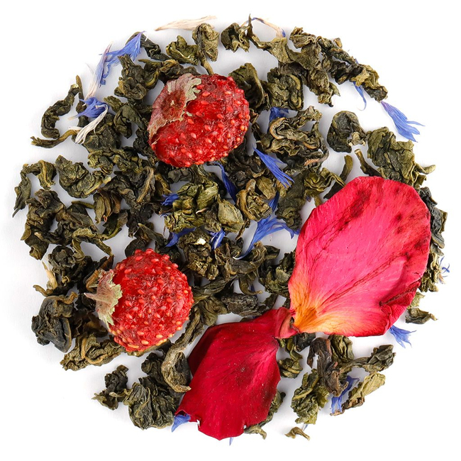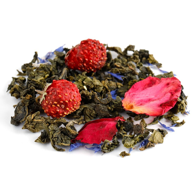 Состав: чай улун китайский, клубника ягоды, роза лепестки, василек лепестки, аромат земляники и тропических фруктов.