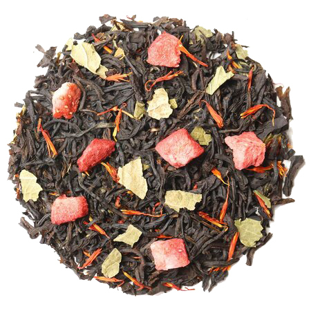 Состав: чай черный цейлонский, кусочки клубники, лепестки сафлора, листья смородины, аромат клубники и сливок.