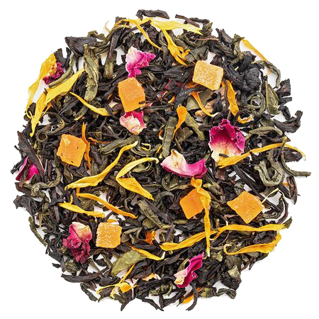 Состав: чай черный индийский, чай зеленый китайский крупнолистовой, кусочки ананаса, изюм красный, лепестки розы красной, лепестки календулы, аромат нектарина.