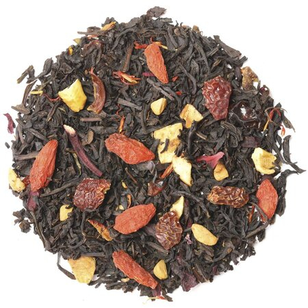 Благоухающий черный чай с индийских плантаций дополнен игривыми лепестками каркадэ и сафлора, а завораживающий вкус - тандем кусочков яблока, измельченных плодов шиповника и драгоценных ягод годжи.