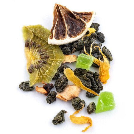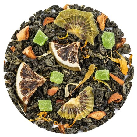 Состав: чай зелёный китайский, яблоко кусочки, ананас кусочки, киви дольки, лайм сегменты, календула лепестки, ароматизатор "Кактус.