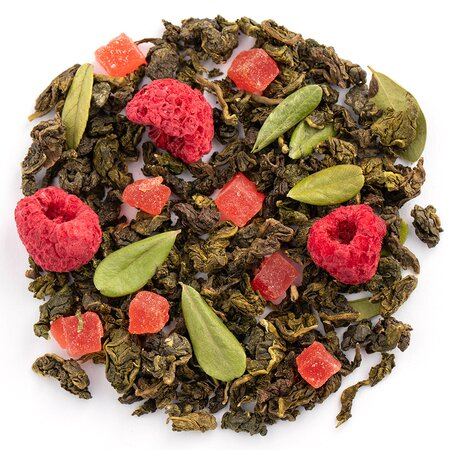 Состав: чай улун китайский, цукаты ананаса, ягоды малины, листья брусники, аромат малинового сорбета.