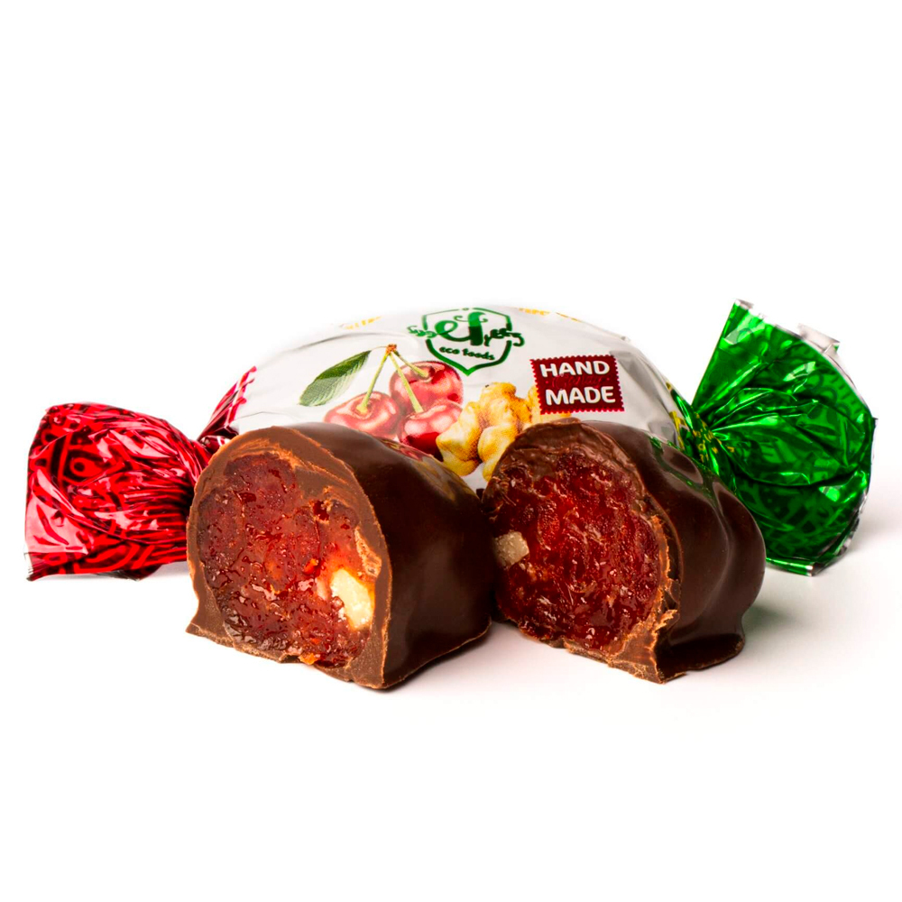 Состав: вишня, глазурь(сахар, заменитель какао масла нетемперируемый лауринового типа(фракция гидрогенизированного масла), эмульгаторы(соевый лецитин, Е492), какао порошок, ароматизатор "Ванилин", сахар, глюкозно-фруктозный сироп, ароматизатор "Вишня", ядра грецкого ореха.