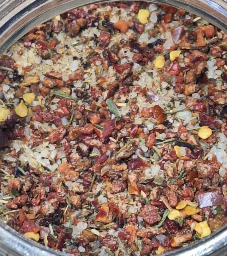 Состав: поваренная соль, смесь трех перцев (сладкий, красный и черный), чеснок, базилик, укроп, петрушка.