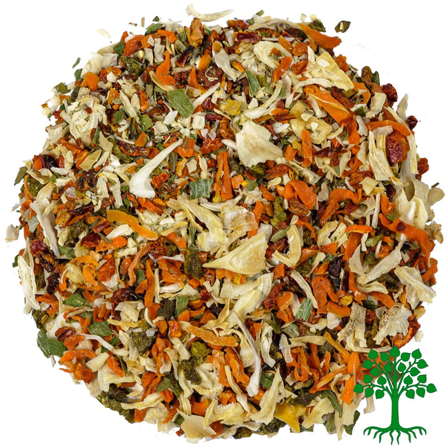 Состав: соль, кориандр молотый, паприка красная дробленая, морковь, чеснок гранулы, лук гранулы, петрушка зелень, перец черный молотый, перец красный острый молотый, розмарин, томатный порошок, базилик лист, майоран, орегано.
